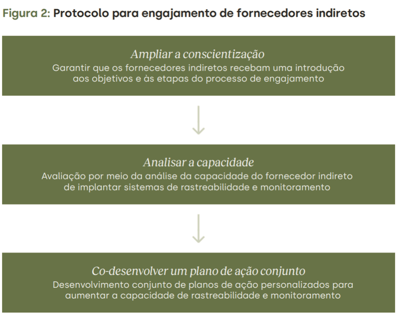 Compreender as práticas de rastreabilidade atuais dos fornecedores indiretos fornece insights para mitigação de riscos e ação coletiva em prol de cadeias de suprimentos sustentáveis. Para garantir o compromisso com os padrões DCF, a equipe de Monitoramento de uso da terra estabeleceu um processo de três etapas para o envolvimento de fornecedores indiretos: