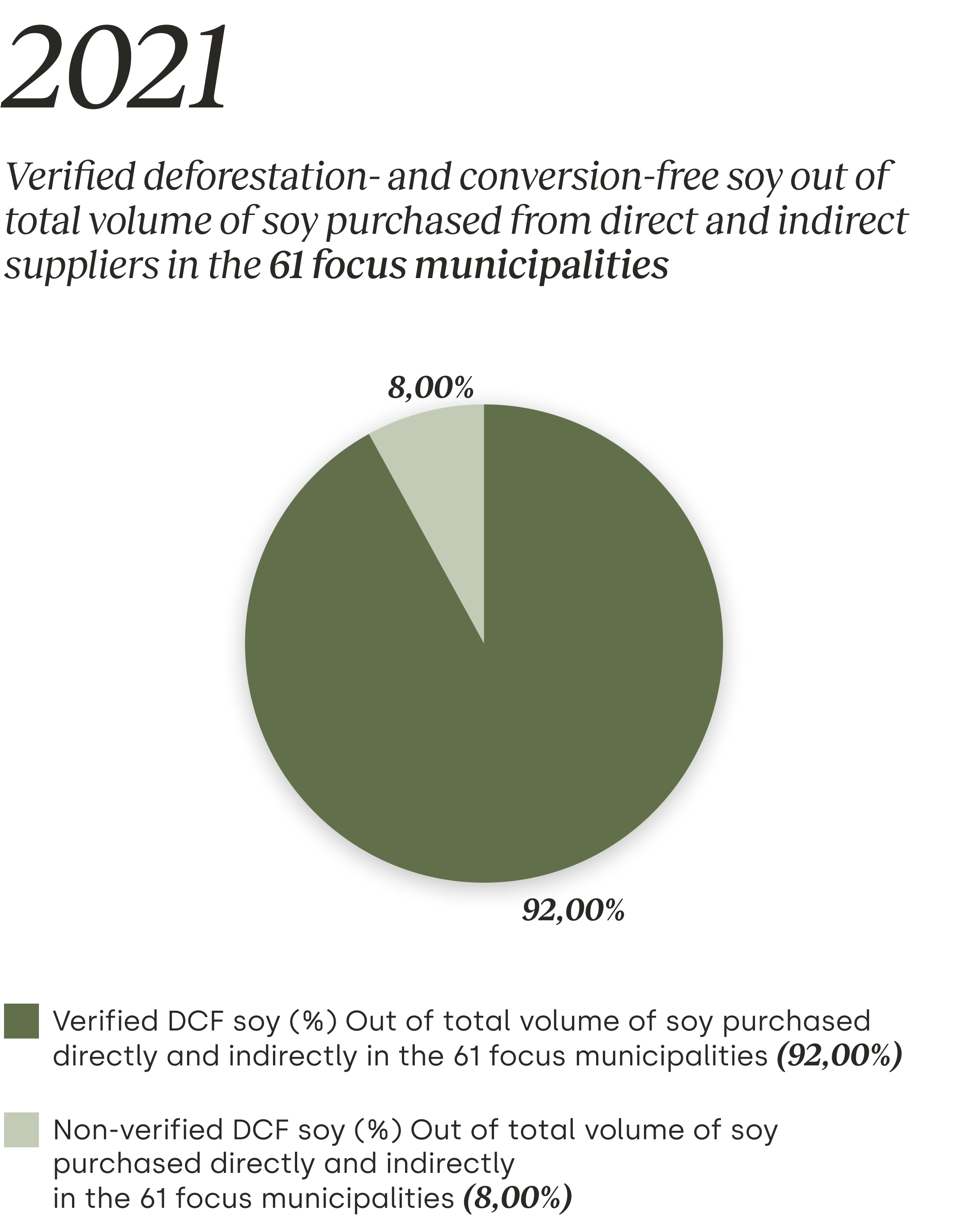 A Agrícola Alvorada, buscando evoluir na consolidação de uma cadeia de fornecimento caracterizada pelos mais altos padrões socioambientais, está sempre aprimorando a análise de nossos fornecedores para adquirir de forma sustentável as nossas principais commodities. Fomos a primeira empresa a aderir ao Parceria Sustentável Bunge, programa que compartilha ferramentas, metodologias e conhecimentos para rastreabilidade e aprimoramento da avaliação socioambiental de fornecedores da cadeia diretos e indiretos da soja. A iniciativa dá acesso a sistemas e tecnologias, incluindo dados de imagens de satélite, que possibilitam ver e saber o que está acontecendo em cada propriedade com a qual nos relacionamos. Por meio do Parceria Sustentável e outras plataformas de geoprocessamento, nós fortalecemos e aprimoramos a gestão e o monitoramento da nossa rede de suprimentos de soja, nos permitindo, pela primeira vez, mensurar o volume total de grãos livres de desmatamento e conversão (DCF) que originamos nos munícipios definidos como prioritários para atuação do Soft Commodities Forum. Estamos trabalhando para aumentar gradativamente nossos volumes DCF, atualmente em 94% já rastreados, até alcançarmos os objetivos compartilhados com a Bunge, de cadeias integralmente livres de desmatamento em 2025.